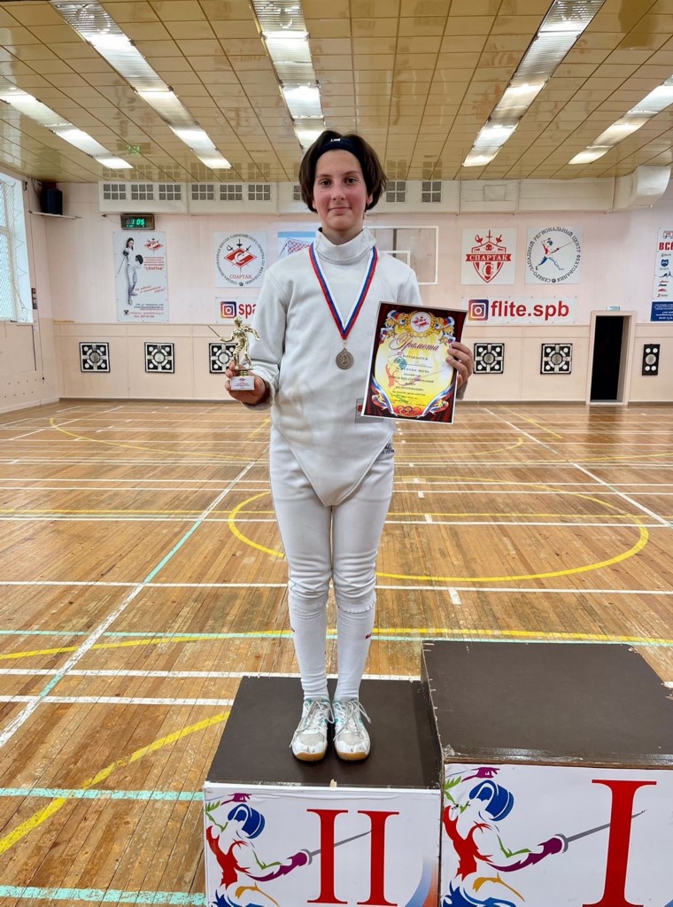 Поздравляем нашу воспитанницу! Это её первая медаль завоеванную на городском уровне в личном первенстве! С уверенностью можно сказать, что при сохранении должного отношения к занятиям по фехтованию её ждёт впереди ещё много медалей!